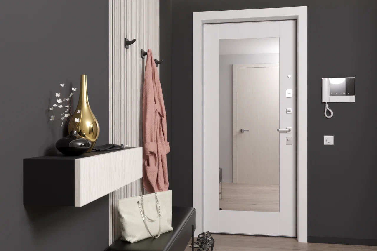 В качестве внутренней отделки двери - декоративная ламинированная МДФ панель Нарцисс 05 толщиной 16 мм с зеркалом.