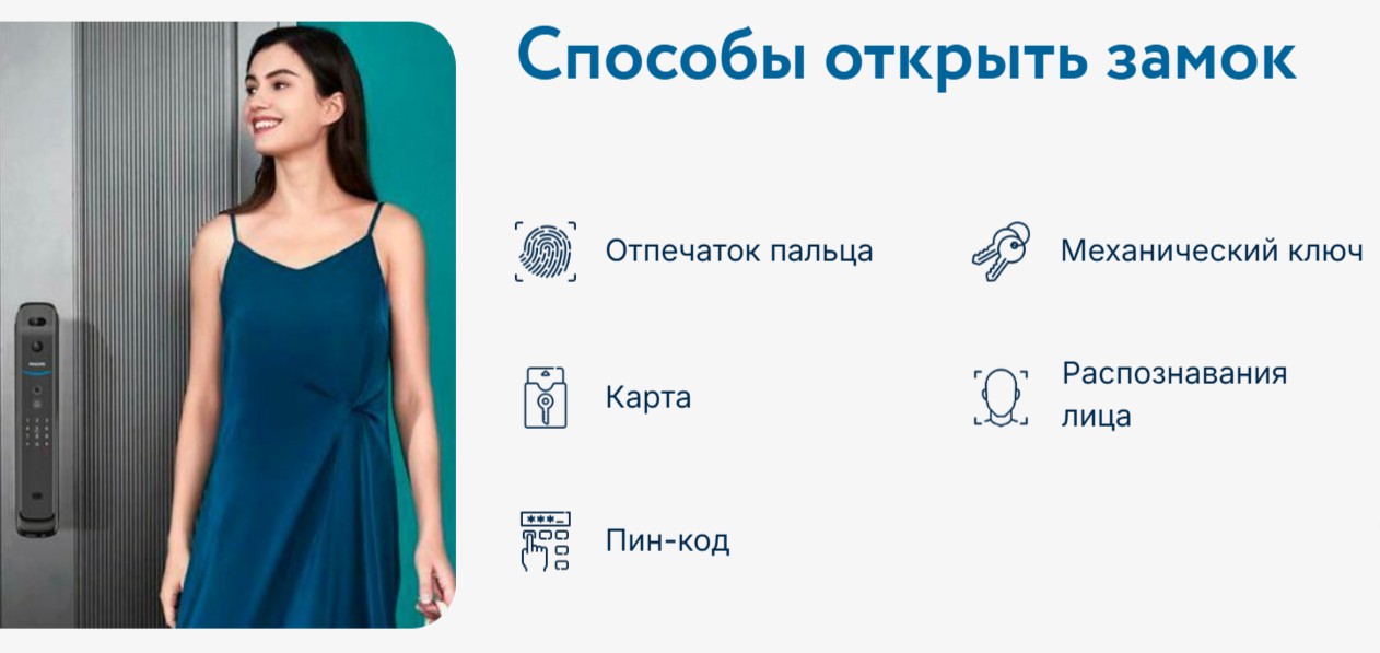 2. Способы открытия: Распознавания лица, пин-код, отпечаток пальца, RFID-карта, механический ключ.